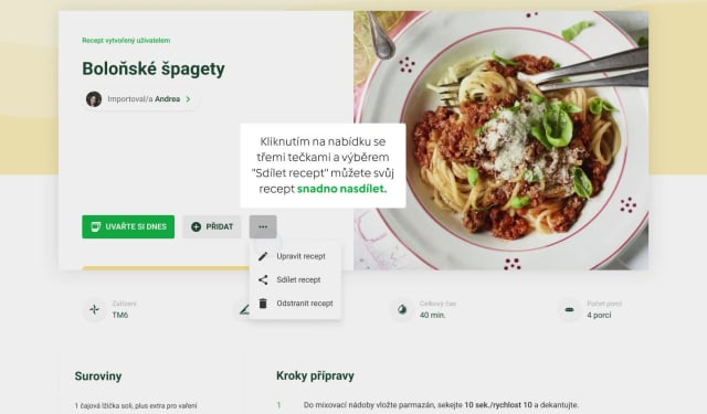Nezapomeňte šířit radost a sdílejte svá kulinářská díla se svými přáteli a rodinou prostřednictvím oblíbených kanálů! Stačí kliknout na tři tečky v pravém dolním rohu receptu a vybrat možnost „Sdílet recept". Pak si můžete vybrat sdílení prostřednictvím sociálních médií, e-mailu nebo odkazu.