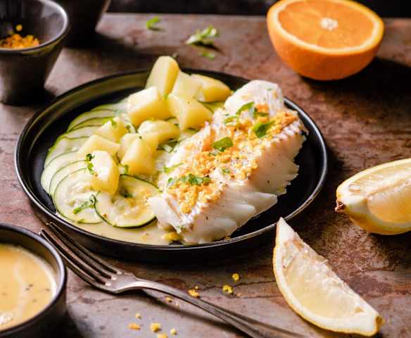 Treska v páře s petrželovou krustou, novými bramborami a cuketou