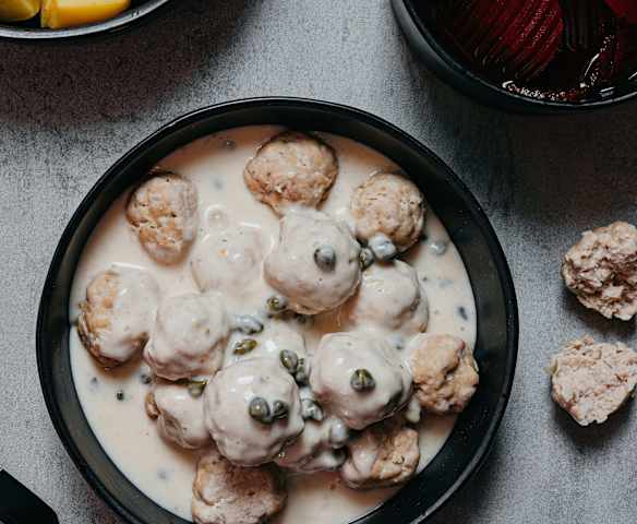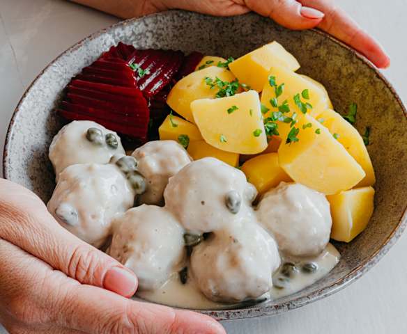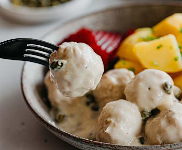 Masové kuličky v kaparové omáčce s bramborami