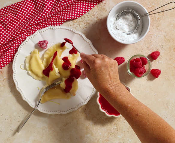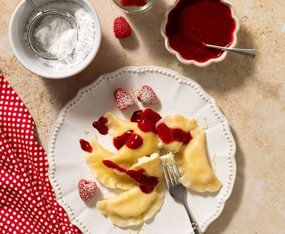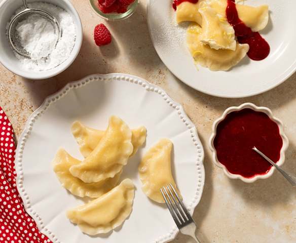 Cream cheese pierogi with raspberry sauce