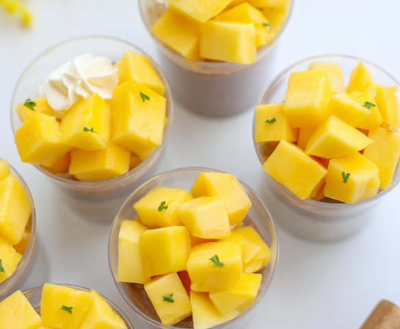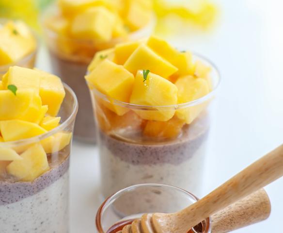 พุดดิ้งกะทิข้าวหอมมะลิ-ข้าวไรซ์เบอร์รีกับมะม่วงน้ำผึ้ง
